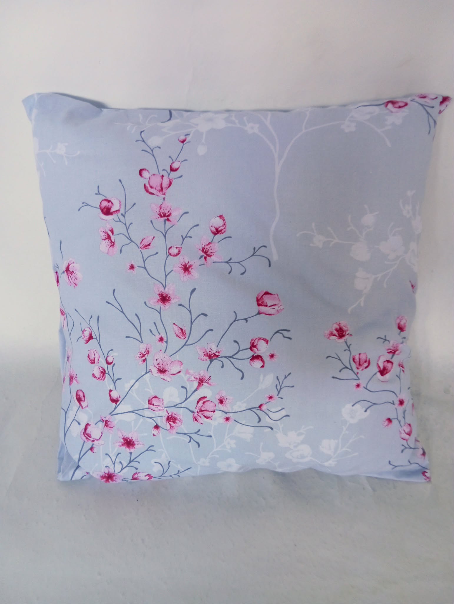 Pościel ma delikatny, romantyczny wzór kwiatowy. Na jasnym, pastelowym tle w odcieniu błękitno-szarym znajdują się drobne gałązki z kwitnącymi różowo-fuksjowymi kwiatami, przypominającymi kwiaty wiśni lub jabłoni. Cienkie, ciemniejsze linie gałązek nadają wzorowi lekkości i elegancji, a subtelne białe motywy roślinne w tle tworzą wrażenie głębi.