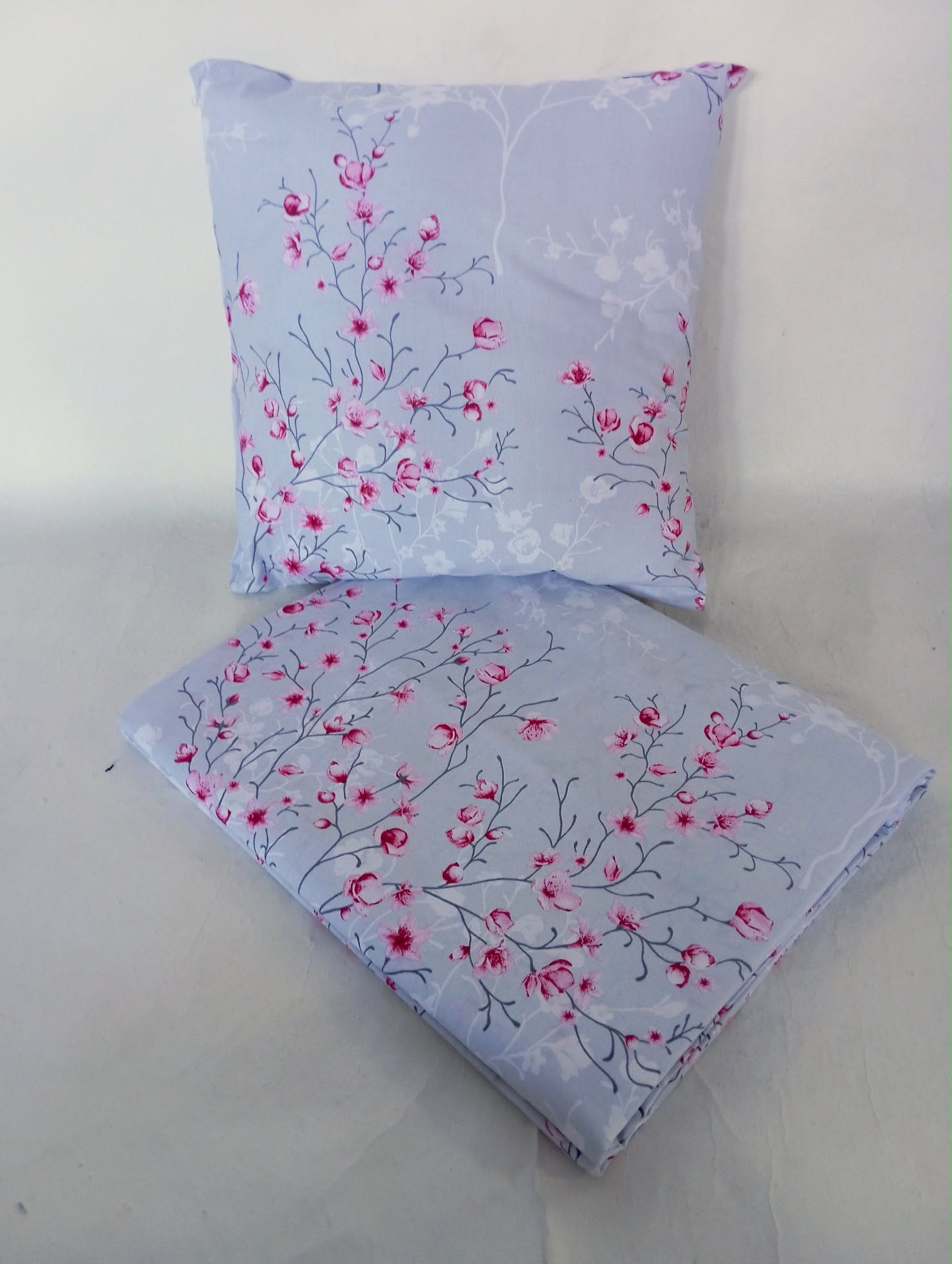 Pościel ma delikatny, romantyczny wzór kwiatowy. Na jasnym, pastelowym tle w odcieniu błękitno-szarym znajdują się drobne gałązki z kwitnącymi różowo-fuksjowymi kwiatami, przypominającymi kwiaty wiśni lub jabłoni. Cienkie, ciemniejsze linie gałązek nadają wzorowi lekkości i elegancji, a subtelne białe motywy roślinne w tle tworzą wrażenie głębi.